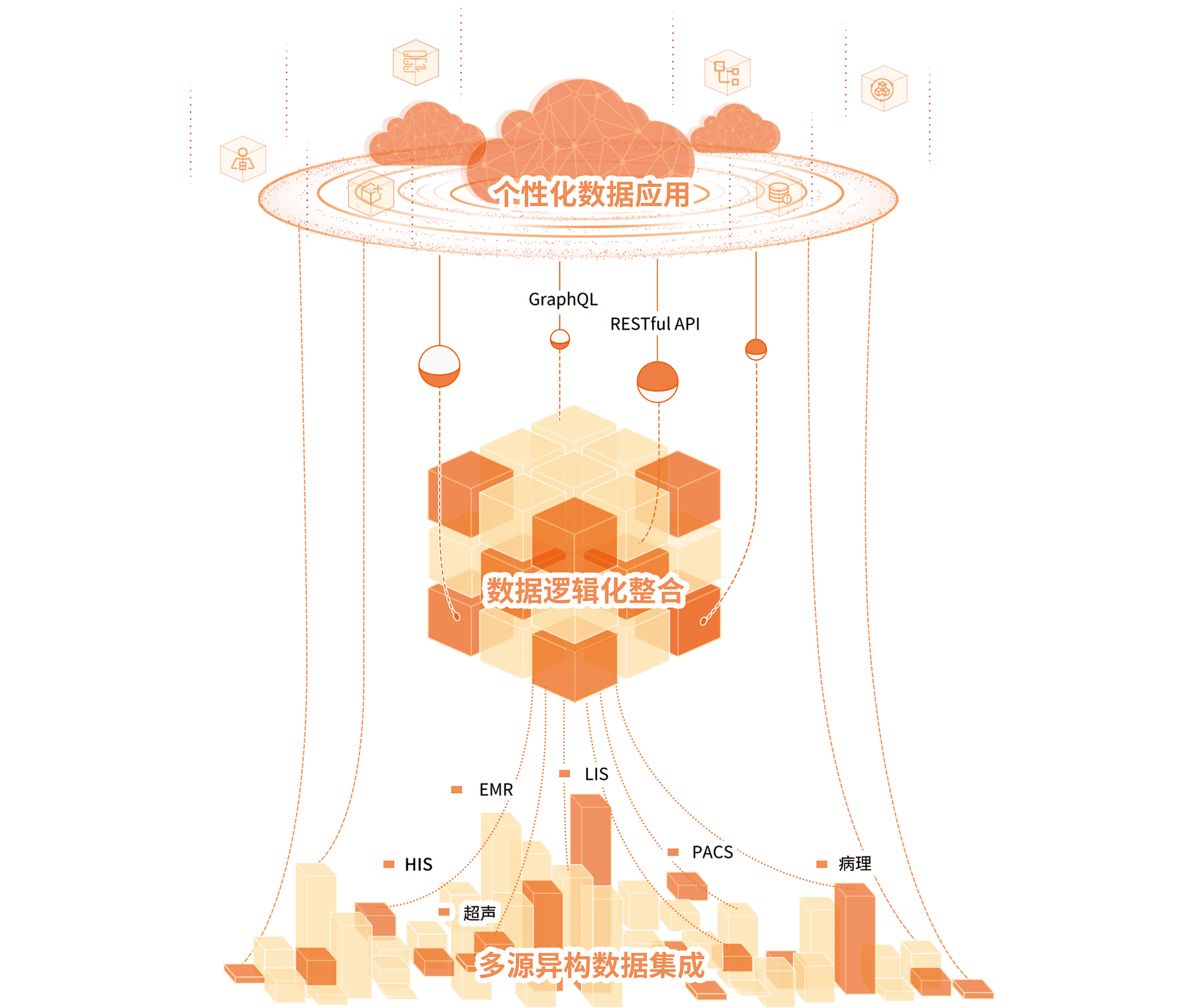 醫(yī)眾醫(yī)療數據服務采用 Data Fabric 數據編織的架構理念,幫助用戶應對在數據資產化進程中產生的復雜性、分布式、多元化等因素,從單純的以數據應用為核心建設數字化,向體系化的數據服務能力建設轉型。